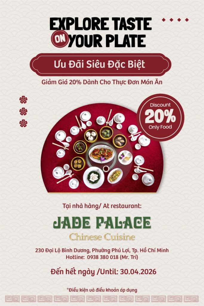 Đặc biệt, ưu đãi GIẢM 20% trên tổng hóa đơn món ăn dành cho thực khách yêu thích ẩm thực Trung Hoa.