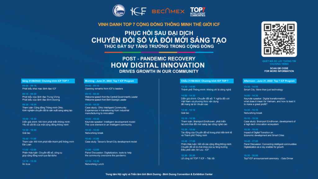 The ICF has chosen Binh Duong province to present the 2022 Top7 Intelligent Communities conference and announcement: “After the Pandemic: How Digital Innovation Drives Growth in Our Communities” at Binh Duong World Trade Center on June 20-21.
